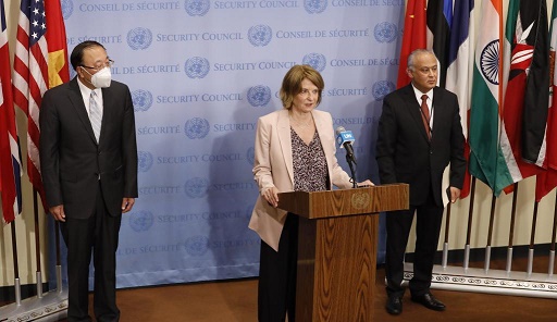 5月16日,在位于紐約的聯(lián)合國(guó)總部,中國(guó)常駐聯(lián)合國(guó)代表張軍(左)同挪威常駐聯(lián)合國(guó)代表莫娜·尤爾(中)、突尼斯常駐聯(lián)合國(guó)代表拉德布共同會(huì)見(jiàn)記者。新華社記者 謝鍔 攝