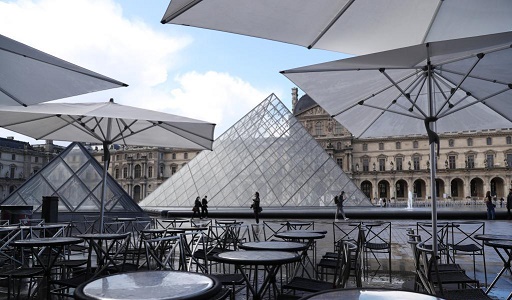 5月19日,法國巴黎盧浮宮博物館旁的餐館戶外區(qū)域準備迎客。新華社記者高靜攝