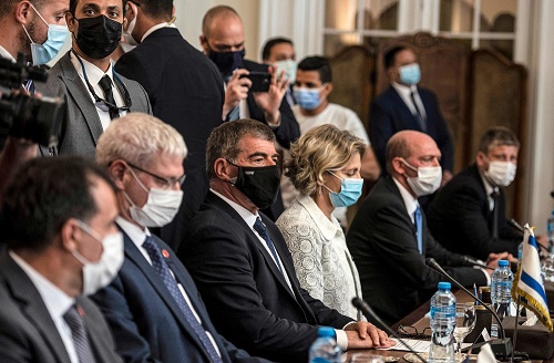 5月30日,以色列外交部長(zhǎng)阿什克納齊(前排左三)在埃及開羅與埃及外交部長(zhǎng)舒凱里(不在畫面中)舉行會(huì)談。新華社/法新