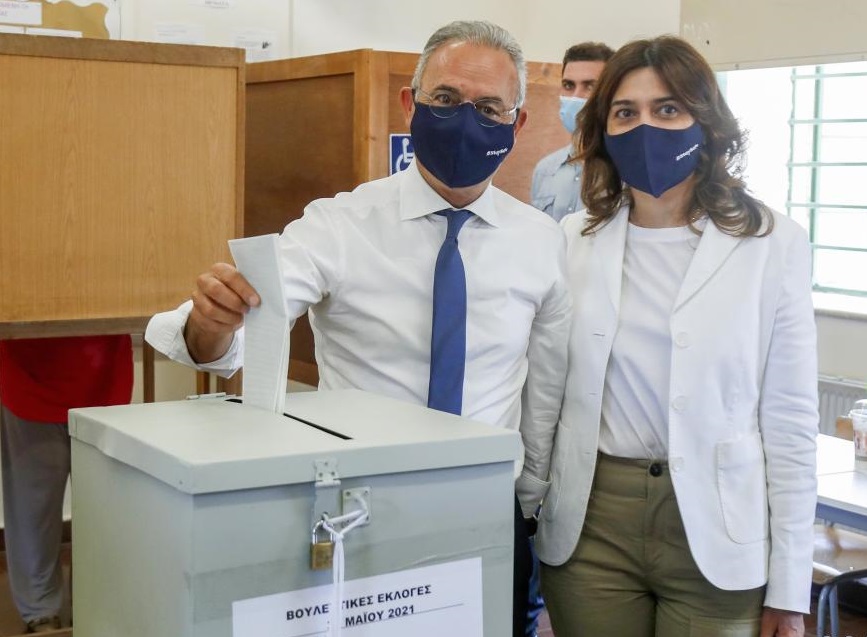 5月30日,塞浦路斯民主大會(huì)黨領(lǐng)導(dǎo)人、候選人內(nèi)奧菲圖(左)在首都尼科西亞的一處投票站投票。