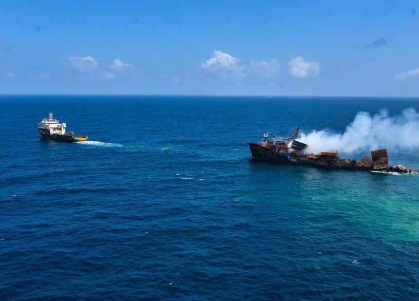 這是6月2日在斯里蘭卡科倫坡港附近拍攝的逐漸下沉的起火貨船“X-PRESS PEARL”號(右)。