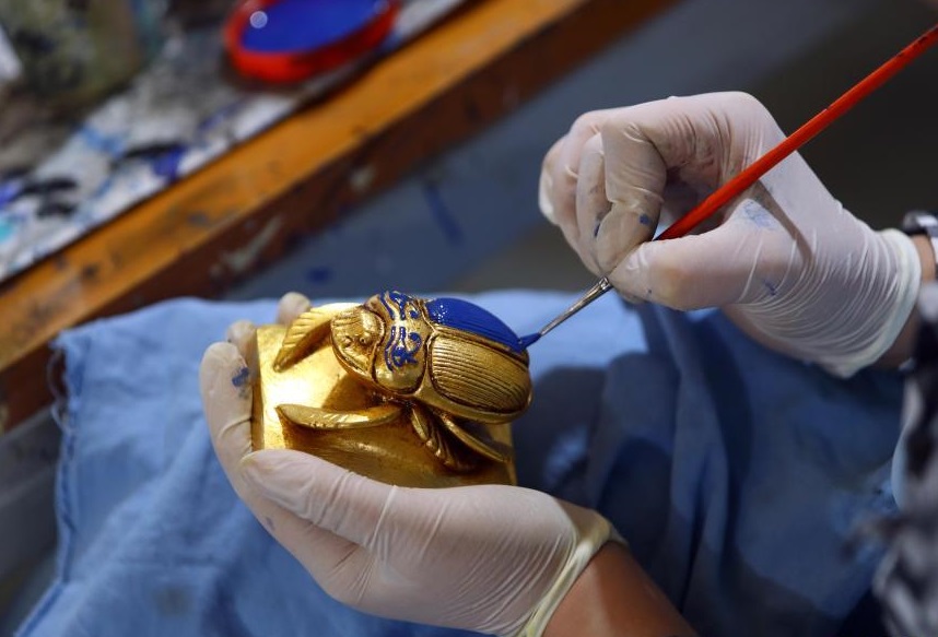 5月25日,在位于埃及蓋盧比尤省的科努茲埃及文物復(fù)制品工廠,工作人員給一尊圣甲蟲雕塑復(fù)制品上色。