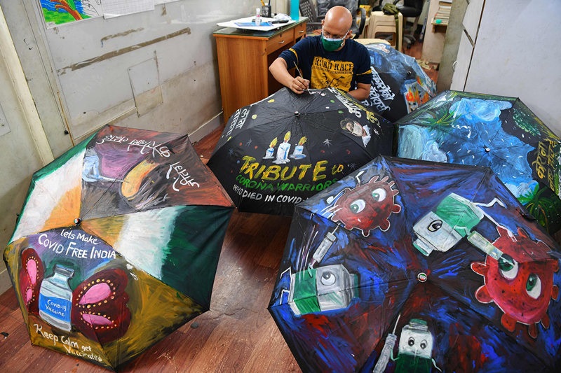 人民網(wǎng)訊 當?shù)貢r間6月3日,印度孟買,一所藝術學校里的藝術老師Sagar Kambli繪制新冠疫苗防疫主題雨傘,以提醒學生們通過接種新冠疫苗防疫。