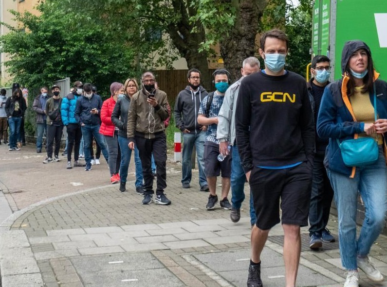 6月19日,人們在英國倫敦一家新冠疫苗接種中心外排隊。