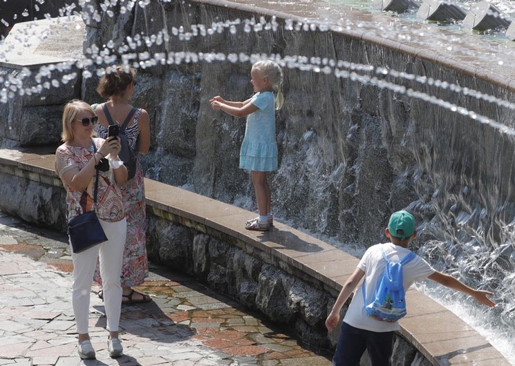 人民網(wǎng)訊 當?shù)貢r間2021年6月24日,俄羅斯莫斯科發(fā)布橙色天氣警報,該地區(qū)溫度高達36攝氏度。人們在Manezhnaya廣場的噴泉邊避暑。