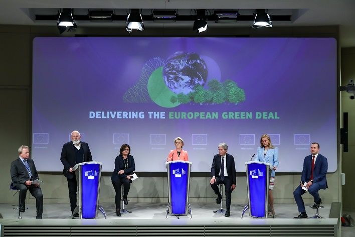 7月14日,歐盟委員會(huì)主席馮德萊恩(左四)、第一副主席蒂默曼斯(左二)等在比利時(shí)布魯塞爾出席應(yīng)對(duì)氣候變化一攬子計(jì)劃提案發(fā)布會(huì)。