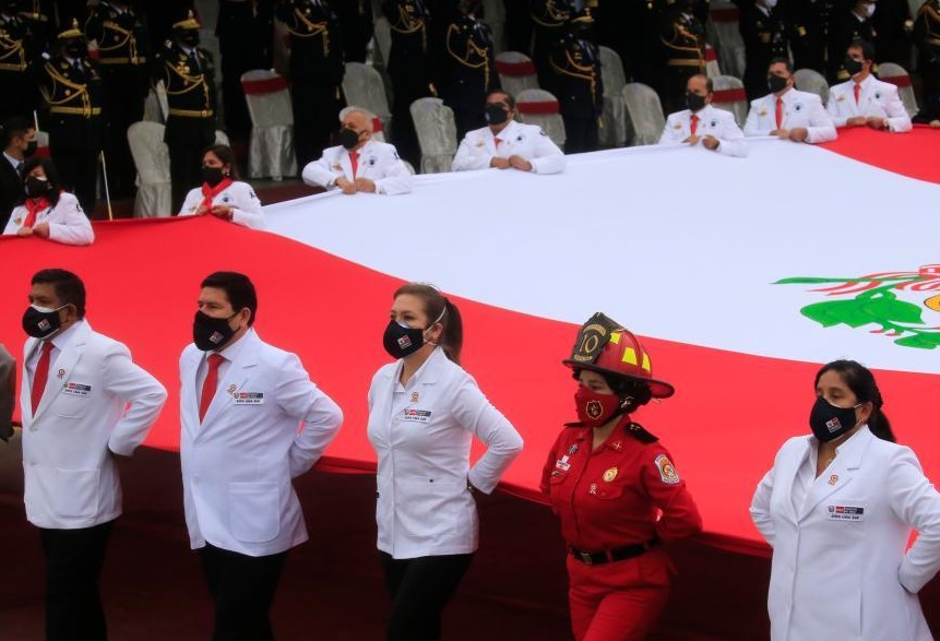 7月30日,在秘魯首都利馬陸軍總部,參加過抗疫的醫(yī)務人員和軍人舉著秘魯國旗參加閱兵式。