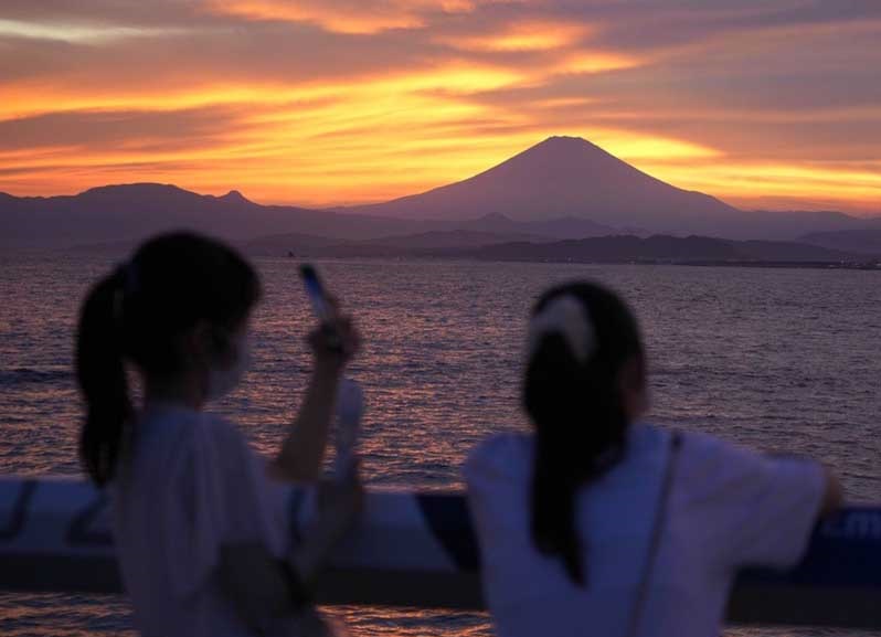 人民網(wǎng)北京8月7日電 當(dāng)?shù)貢r(shí)間8月5日,日本江之島,民眾眺望富士山夕陽,落日余暉晚霞醉人。