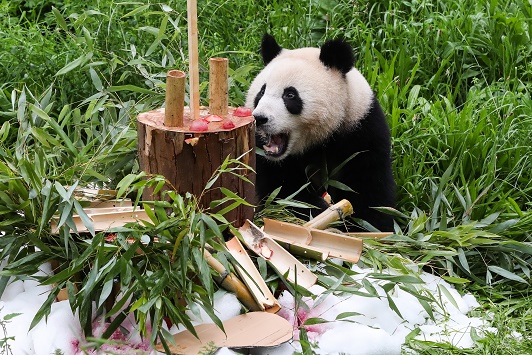 8月31日,大熊貓幼崽“夢圓”在德國柏林動物園享用“生日蛋糕”。