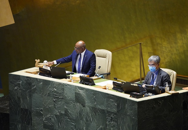 9月27日,在位于紐約的聯(lián)合國總部,第76屆聯(lián)合國大會(huì)主席沙希德(左)宣布一般性辯論閉幕。