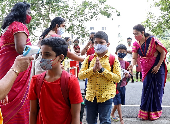 10月25日,在印度班加羅爾,學(xué)生進(jìn)入學(xué)校前接受體溫檢測。