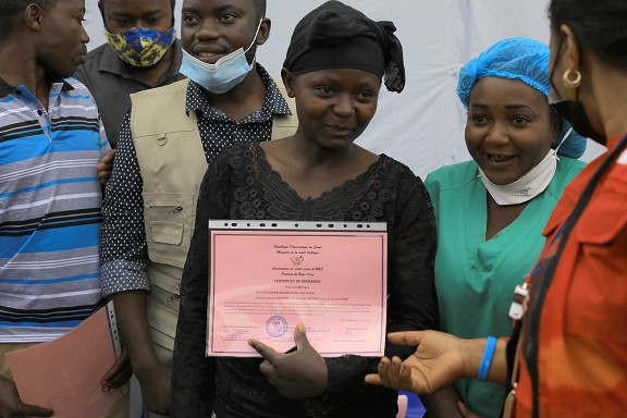 11月4日,在剛果(金)北基伍省貝尼,埃博拉患者在治愈后手持證書準備出院。