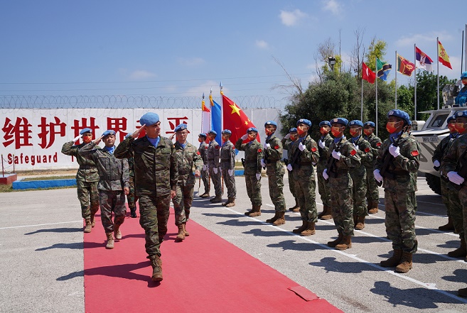 8月3日,在黎巴嫩南部省提爾市的中國維和部隊(duì)營地,聯(lián)合國駐黎巴嫩臨時(shí)部隊(duì)司令拉薩羅少將(左前)檢閱中國維和部隊(duì)。