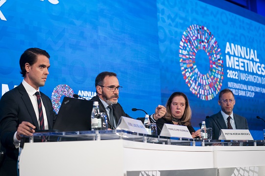 這是10月11日在美國華盛頓拍攝的國際貨幣基金組織(IMF)《世界經(jīng)濟展望報告》新聞發(fā)布會。 新華社記者 劉杰 攝