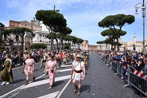 4月23日,人們穿戴古羅馬時期服飾,圍繞羅馬大競技場、威尼斯廣場和斗獸場等景點進行建城2776年慶祝游行。相傳羅馬建城日為公元前753年4月21日。