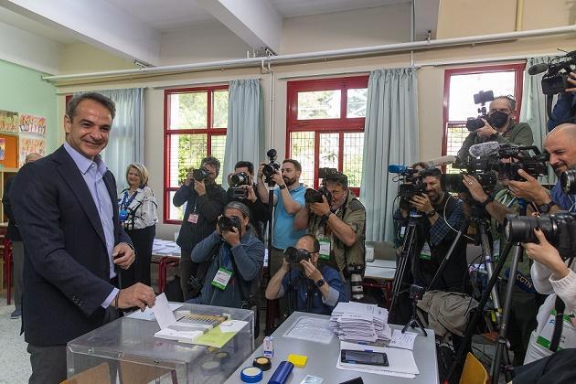 圖為5月21日,希臘總理、新民主黨領(lǐng)導人基里亞科斯·米佐塔基斯在雅典一處投票站投票。新華社發(fā)(馬里奧斯·羅洛斯攝)