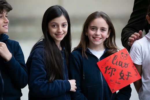 當(dāng)日,在意大利羅馬,羅馬國(guó)立住讀學(xué)校學(xué)生展示自己制作的中意雙語標(biāo)語牌。 新華社記者 李京 攝