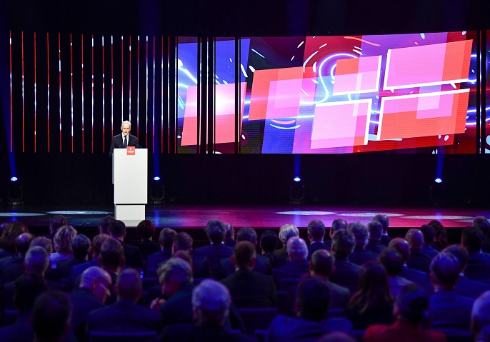 4月21日,挪威首相斯特勒在德國(guó)漢諾威工業(yè)博覽會(huì)開幕式上致辭。挪威是今年展會(huì)主賓國(guó)。 新華社記者 任鵬飛 攝