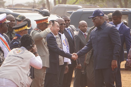 6月22日,在剛果(金)首都金沙薩,剛果(金)總統(tǒng)齊塞克迪(前右)在開工儀式上與中方企業(yè)代表握手。新華社記者 史彧 攝