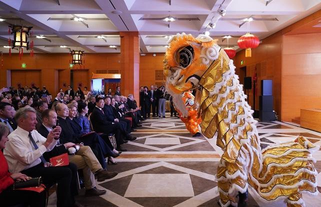 1月24日,在美國首都華盛頓舉辦的新春招待會(huì)上,來賓觀看舞獅表演。新華社記者 吳曉凌 攝