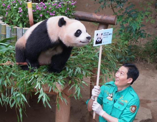 7月7日,在韓國京畿道龍仁市愛寶樂園,大熊貓“睿寶”與飼養(yǎng)員姜哲遠(yuǎn)互動。新華社發(fā)(孫一然攝)