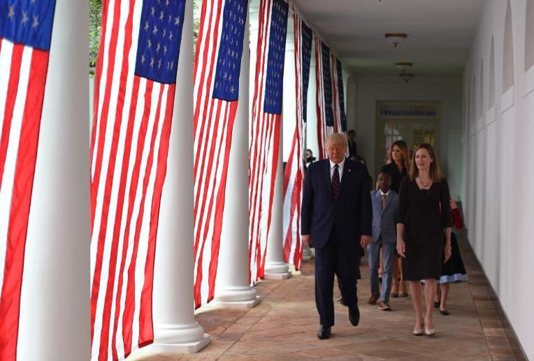 2020年9月26日,在第一任期的美國(guó)總統(tǒng)特朗普(前左)和時(shí)任美國(guó)聯(lián)邦第七巡回上訴法院法官艾米·科尼·巴雷特(前右)出席在白宮舉行的提名公布活動(dòng)。新華社/法新