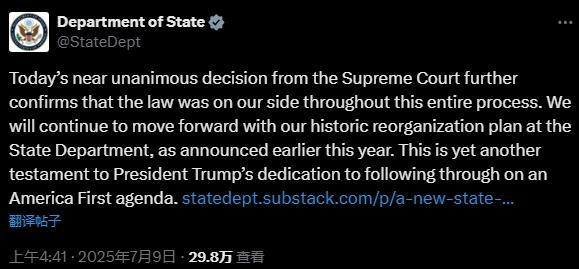 美國(guó)國(guó)務(wù)院當(dāng)天在社交媒體上發(fā)文說(shuō):“我們將繼續(xù)推進(jìn)國(guó)務(wù)院的歷史性重組工作?!?/p>