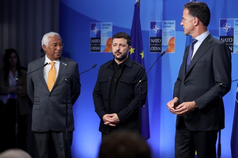 6月24日,在荷蘭海牙,烏克蘭總統(tǒng)澤連斯基(中)在北約峰會(huì)期間對(duì)記者講話。新華社記者趙丁喆攝