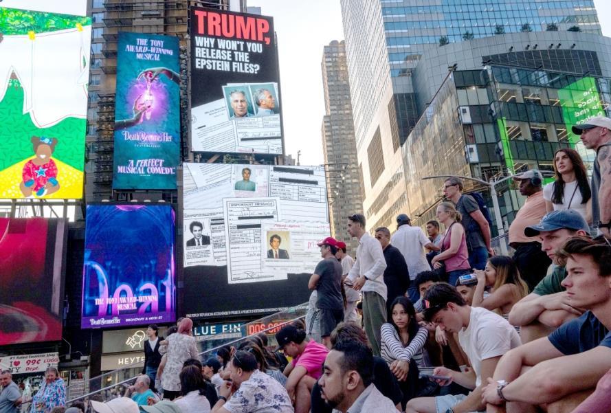 圖為當(dāng)?shù)貢r(shí)間7月23日,美國(guó)紐約時(shí)報(bào)廣場(chǎng)廣告牌呼吁公開(kāi)愛(ài)潑斯坦案所有文件。 CFP供圖