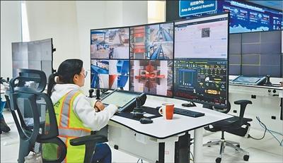 來到錢凱港的遠控操作區(qū),秘魯操作員辛西婭·賈斯帕正在通過電腦控制系統(tǒng)進行港口裝卸的全自動化操作,不時與身旁的中國師傅交流。6塊監(jiān)控屏實時呈現(xiàn)著碼頭裝卸作業(yè)情況,辛西婭指尖輕點控制面板,當集裝箱吊具成功與貨輪甲板完成毫米級對接時,她與中國師傅相視一笑。
