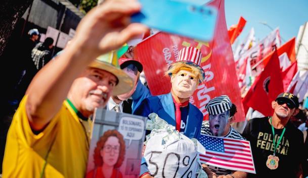 8月至9月,全球多個(gè)國家和地區(qū)的民眾舉行抗議活動,反對美國關(guān)稅政策。圖為巴西民眾在美國駐圣保羅總領(lǐng)事館前抗議美國對巴西征收高額關(guān)稅。 CFP供圖