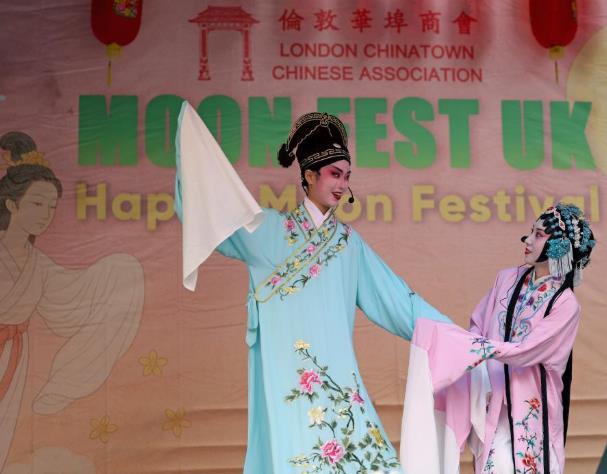 10月5日,演員在英國倫敦舉行的中秋節(jié)慶祝活動上表演戲曲。新華社記者 李穎 攝