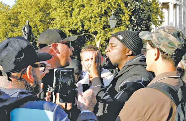 圖為在英國(guó)首都倫敦,對(duì)移民持不同觀點(diǎn)的人們?cè)诳棺h活動(dòng)現(xiàn)場(chǎng)爭(zhēng)辯。 新華社記者 高文成 攝