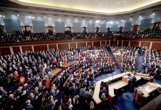 圖為當(dāng)?shù)貢r(shí)間2026年2月24日,美國總統(tǒng)特朗普在國會聯(lián)席會議上發(fā)表國情咨文。 CFP供圖