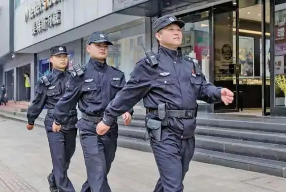 圖為王軍(右一)帶領(lǐng)隊員在安徽合肥步行街街面巡邏。 受訪者供圖