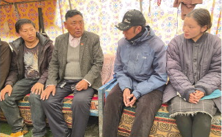 “全國模范人民調(diào)解員”扎西次加(左二)在西藏自治區(qū)那曲市比如縣恰則鄉(xiāng)孔瑪奪村蟲草采集點向群眾宣講法律知識。