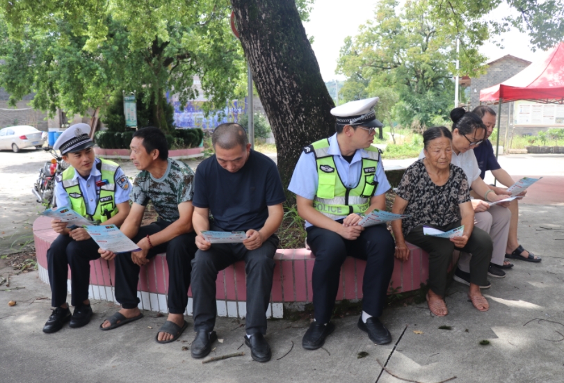 圖為8月22日,民警走進(jìn)206國道旁的市山鎮(zhèn)耀里村向村民宣傳交通安全知識。