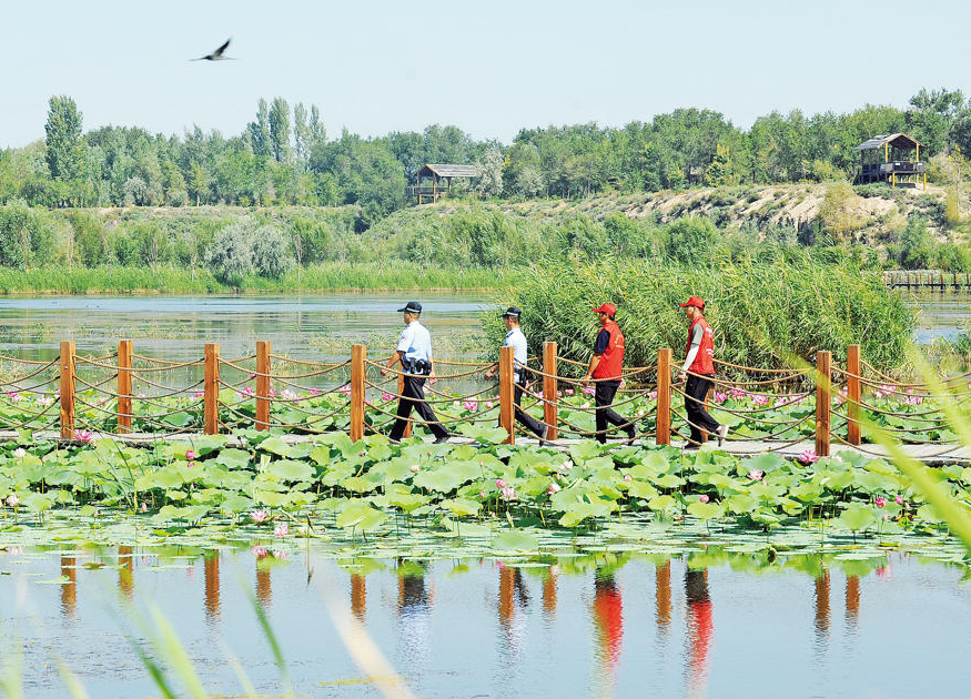 圖為8月19日,瑪納斯縣公安局蘭州灣鎮(zhèn)派出所八家戶警務(wù)室民警與瑪納斯國家濕地公園管委會工作人員一同在瑪納斯國家濕地公園開展巡邏。李進(jìn)福 攝