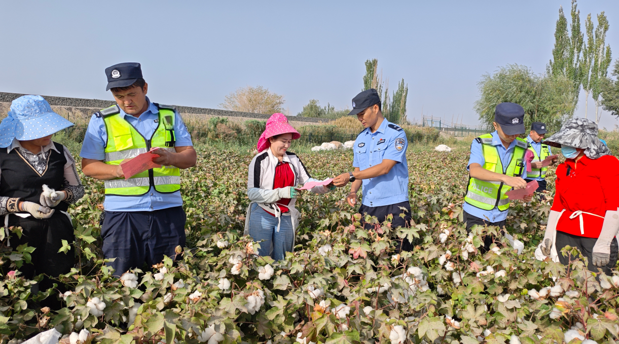 圖為9月22日,巴楚站派出所民警向轄區(qū)鐵路周邊棉田的棉農開展普法宣傳。