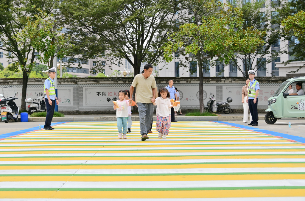 9月23日,由紅、黃、藍(lán)、綠、白五色噴涂構(gòu)建的3D立體多彩斑馬線,在江西省武寧縣多個(gè)校園門口及附近完成施劃作業(yè)并正式“亮相”街頭。