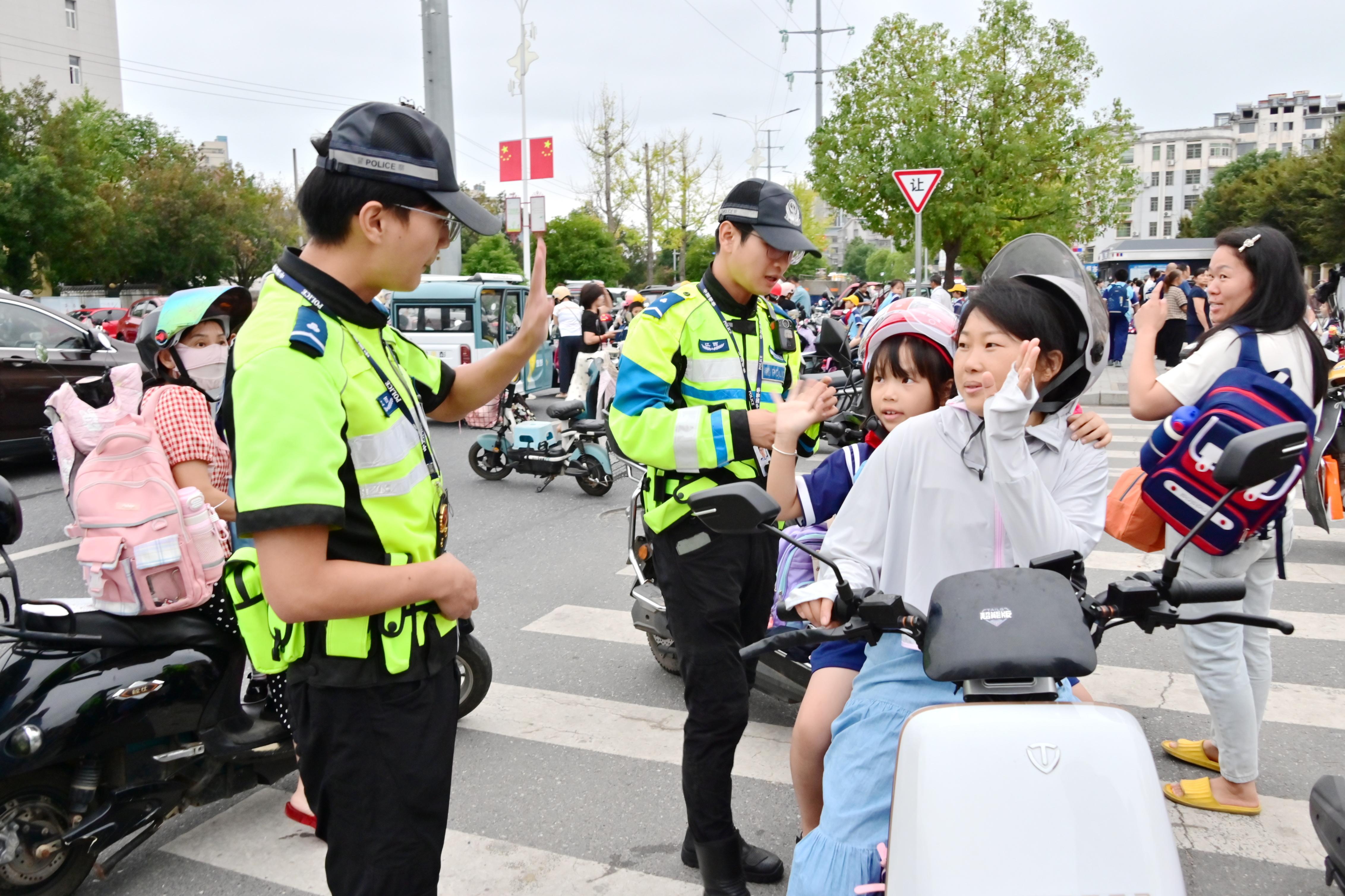 圖為10月13日,武寧交警“鐵騎”隊員在武寧縣第四小學(xué)開展文明交通勸導(dǎo)活動。