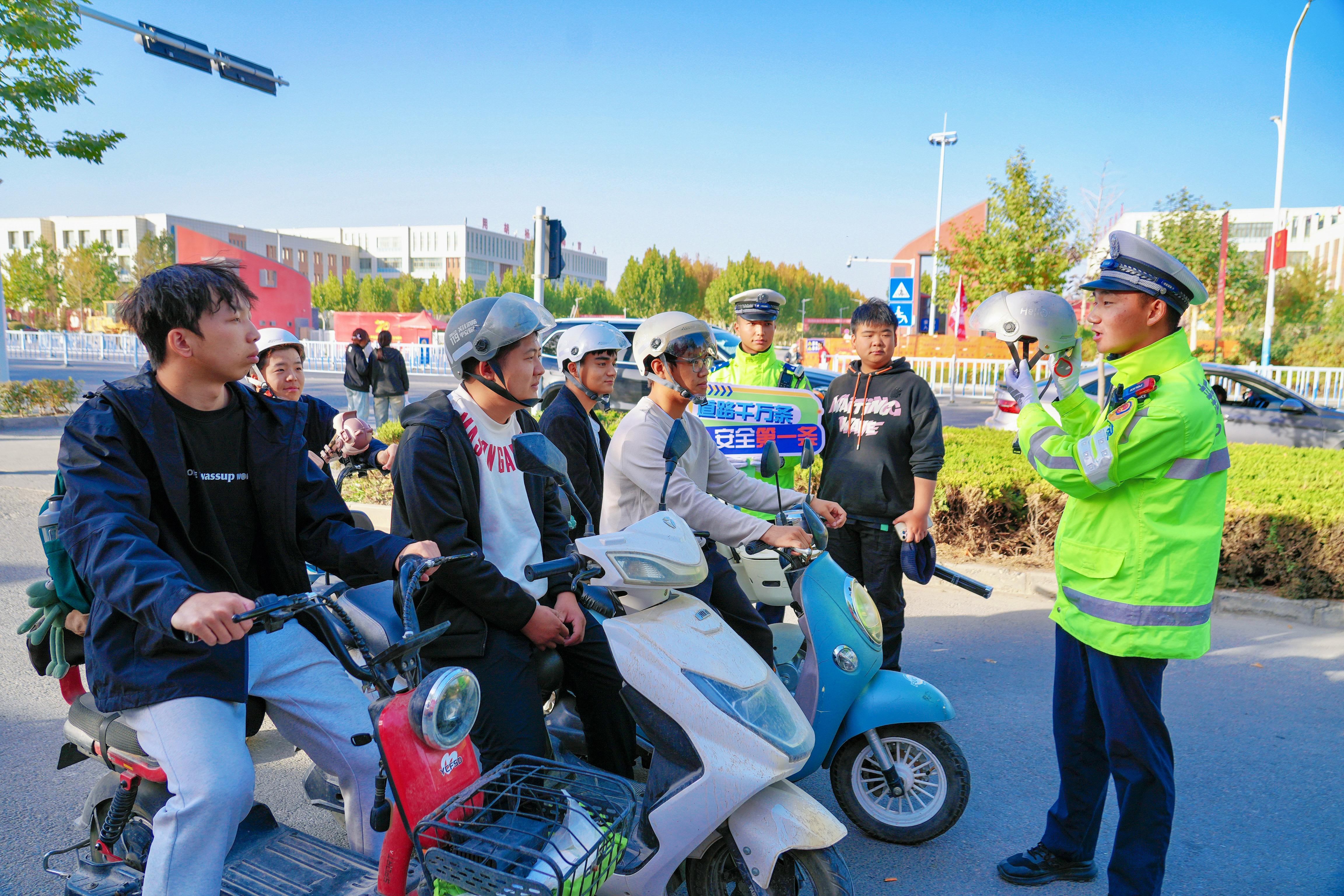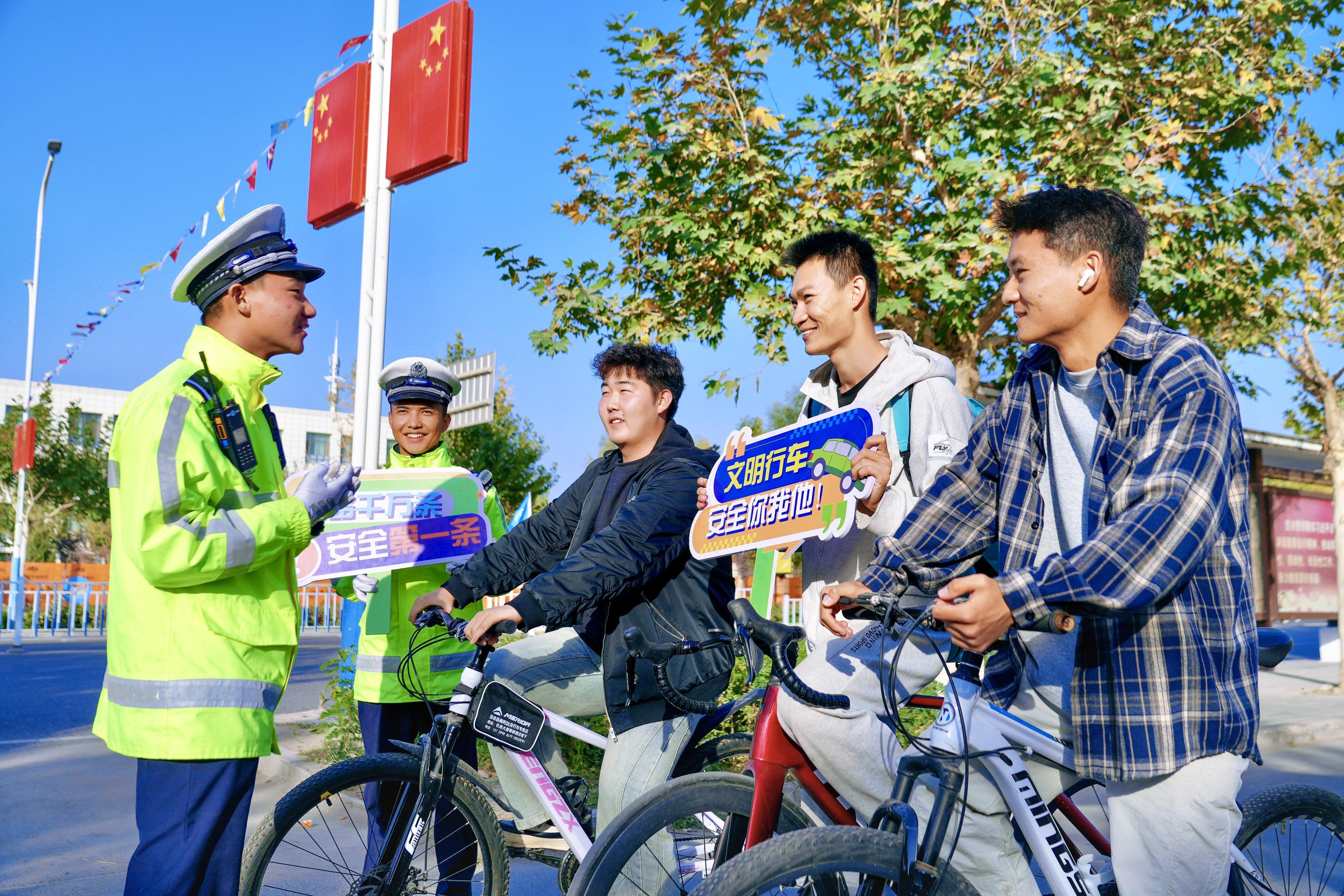圖為10月16日,溫宿縣公安局交通管理大隊(duì)民警向新疆理工學(xué)院學(xué)生普及文明騎車相關(guān)知識,引導(dǎo)學(xué)生切勿逆向行駛。
