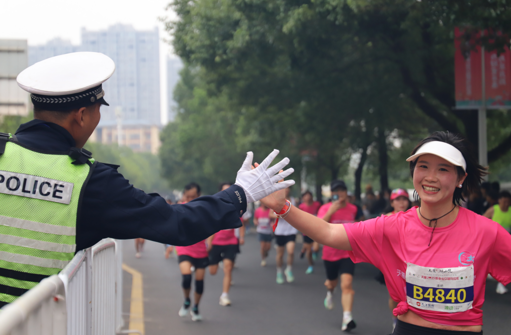圖為執(zhí)勤民警為參賽人員加油鼓勁。