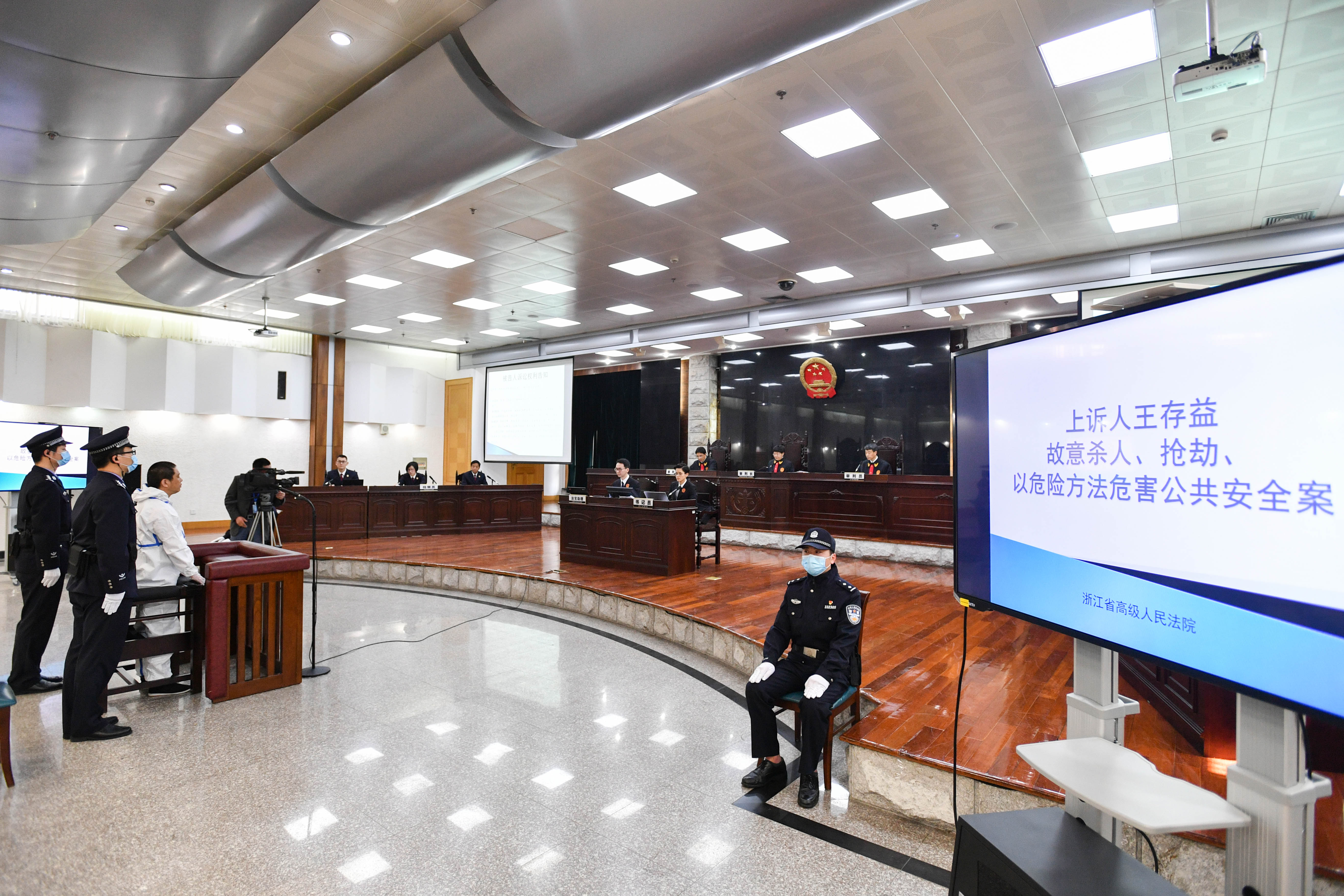 今年4月17日上午,浙江省高級人民法院二審公開開庭審理了王存益故意殺人、搶劫、以危險方法危害公共安全案。浙江省人民檢察院檢察長、二級大檢察官賈宇與檢察員黃茜霞、李明出庭履行職務(wù),浙江高院副院長陳志君擔任審判長,法官梁健、侯天柱擔任審判員,上訴人王存益及其二審辯護人出庭參加訴訟。
