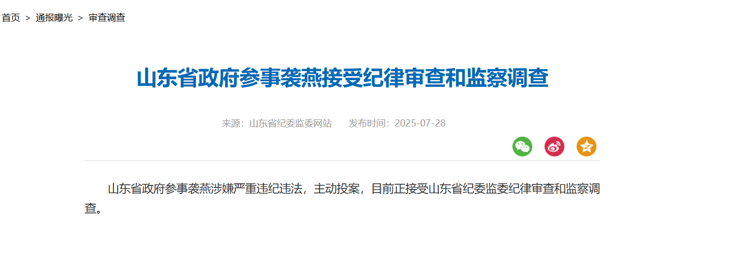 7月28日,據(jù)山東省紀(jì)委監(jiān)委網(wǎng)站消息,山東省政府參事襲燕涉嫌嚴(yán)重違紀(jì)違法,主動(dòng)投案,目前正接受山東省紀(jì)委監(jiān)委紀(jì)律審查和監(jiān)察調(diào)查。