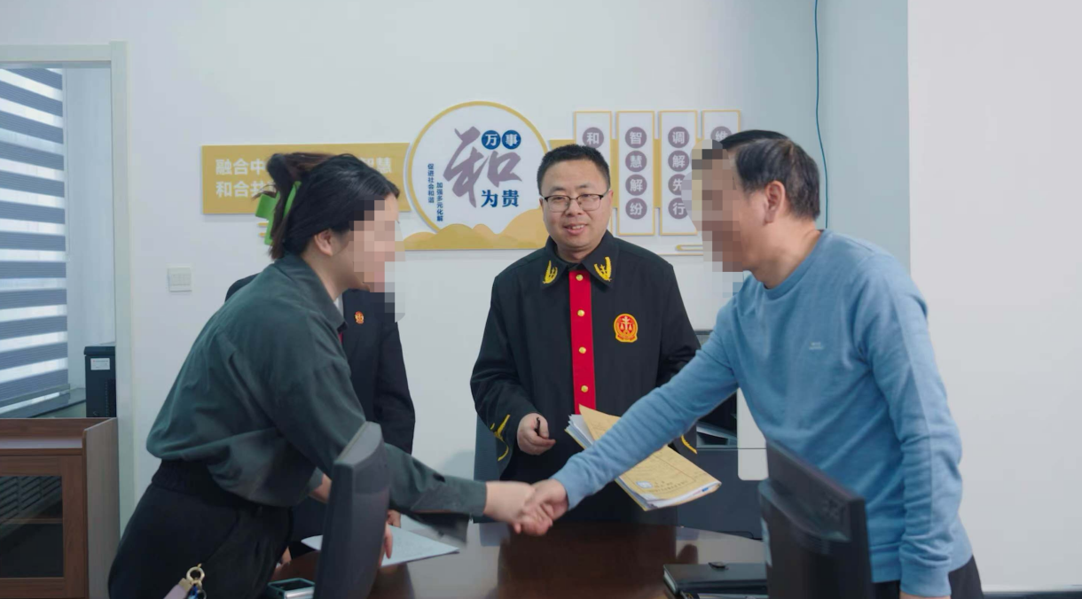 圖為中國(guó)(新疆)自由貿(mào)易試驗(yàn)區(qū)烏魯木齊片區(qū)法庭化解一起買賣合同糾紛,當(dāng)事人雙方握手言和。通訊員 王雅楠 攝