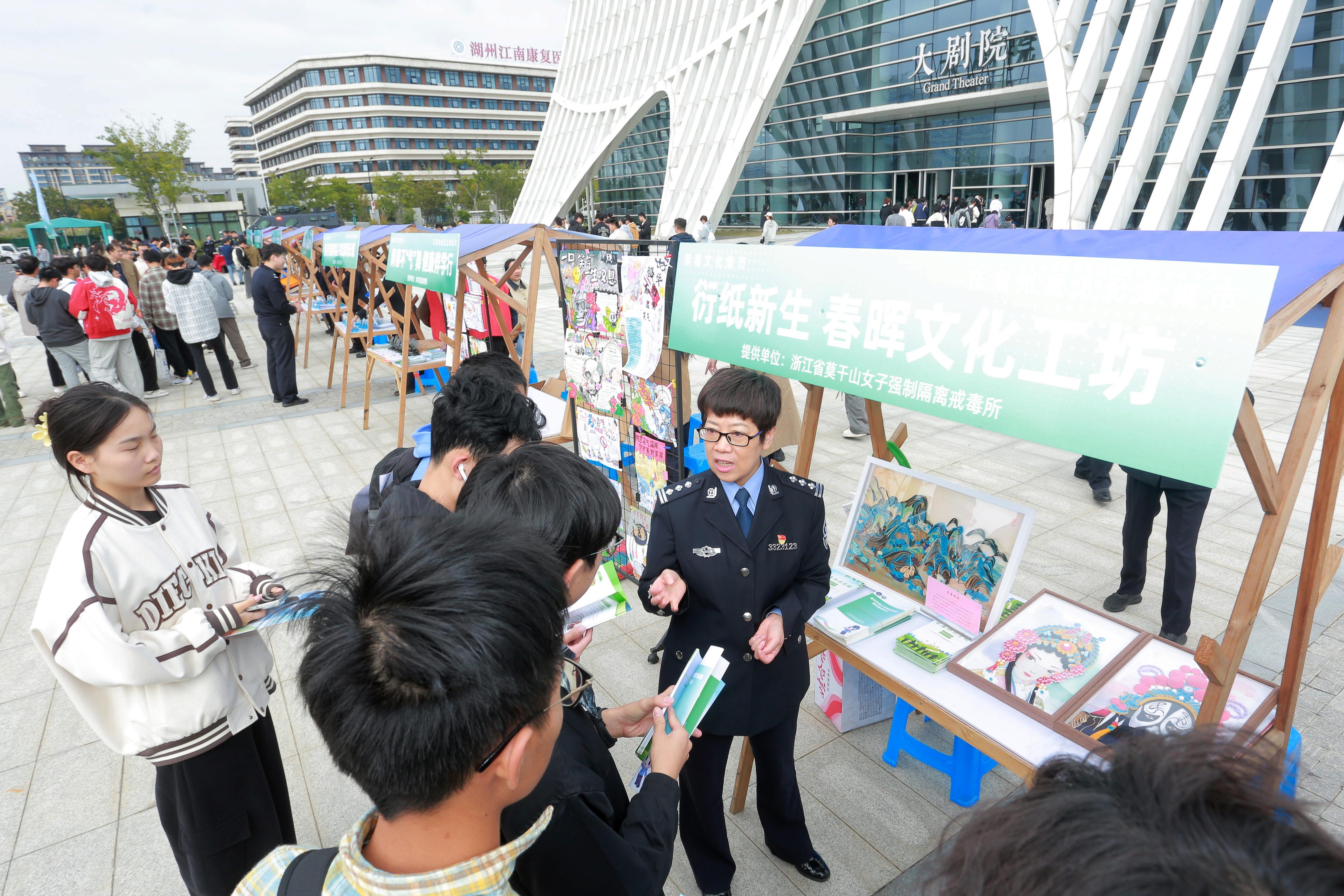 當天,浙江水利水電學院大劇院前廣場的禁毒市集率先“開市”,巨型魔方禁毒logo醒目亮眼,創(chuàng)客大賽獲獎作品集中展出;市公安局特警支隊的緝毒犬現(xiàn)場表演“識毒絕技”,靈敏嗅覺引得師生陣陣驚嘆;“機器狗尋毒”演示展現(xiàn)科技禁毒新力量,南潯公安分局特警裝備與防暴車展示更讓師生直觀感受禁毒執(zhí)法硬實力。此外,湖州市南潯區(qū)公安分局、檢察院、法院、教育局、司法局等十余個禁毒職能部門設攤宣傳,通過“笑氣”模型展示、知識折頁發(fā)放、互動答疑等形式,將“笑氣”危害與防范知識傳遞給每一位參與者。