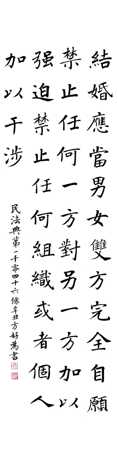 民法典第一千零四十六條 結(jié)婚應(yīng)當(dāng)男女雙方完全自愿,禁止任何一方對(duì)另一方加以強(qiáng)迫,禁止任何組織或者個(gè)人加以干涉。