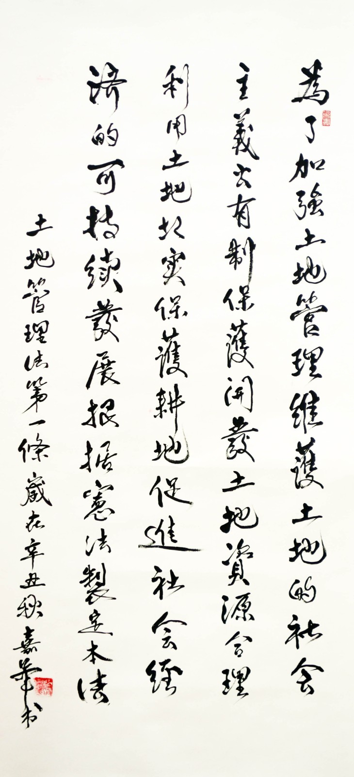 繼1600余位書法家參與書寫《中華人民共和國民法典》全部1260條法條之后,法治日報社聯(lián)合自然資源部法規(guī)司、自然資源部書畫研究會和北京昌平書法家協(xié)會,將筆端對準土地管理“一法一條例”,即《中華人民共和國土地管理法》和《中華人民共和國土地管理法實施條例》。