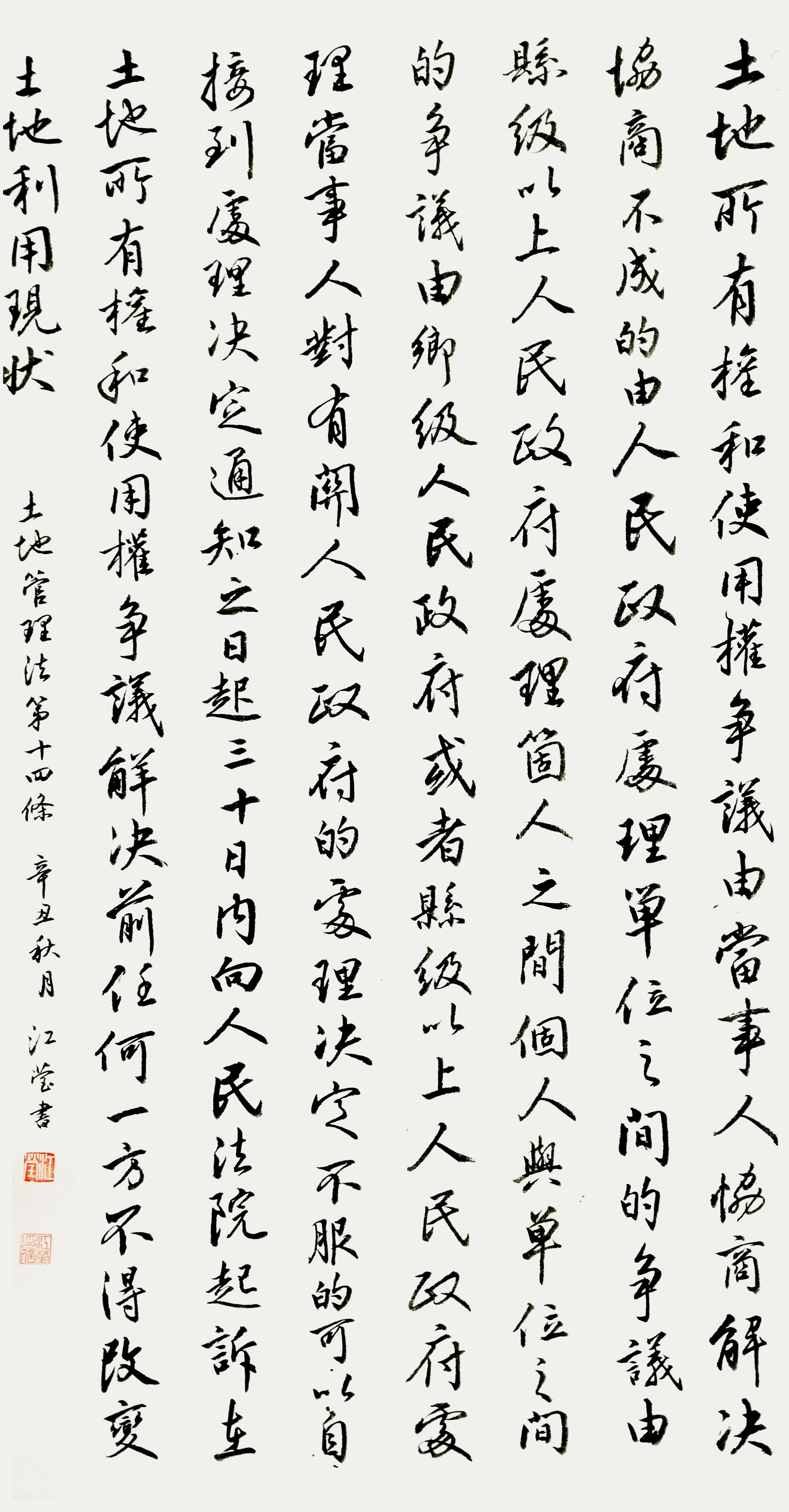 繼1600余位書法家參與書寫《中華人民共和國民法典》全部1260條法條之后,法治日?qǐng)?bào)社聯(lián)合自然資源部法規(guī)司、自然資源部書畫研究會(huì)和北京昌平書法家協(xié)會(huì),將筆端對(duì)準(zhǔn)土地管理“一法一條例”,即《中華人民共和國土地管理法》和《中華人民共和國土地管理法實(shí)施條例》。